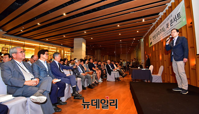김영호 성신여대 교수가 17일 오후 서울 종로구 광화문 아펠가모에서 열린 '반일 종족주의' 북콘서트에서 논평을 하고 있다.