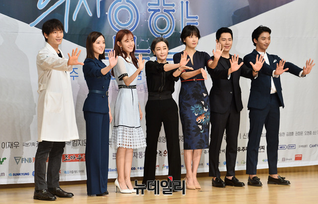 배우 지성(왼쪽부터), 이세영, 정민아, 김혜은, 감독 조수원, 배우 신동미, 이규형, 황희가 18일 오후 서울 양천구 SBS에서 열린 드라마 '의사요한' 제작발표회에서 포토타임을 갖고 있다.