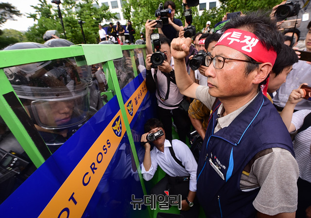 [포토] 경찰과 대치하는 김명환 민노총 위원장