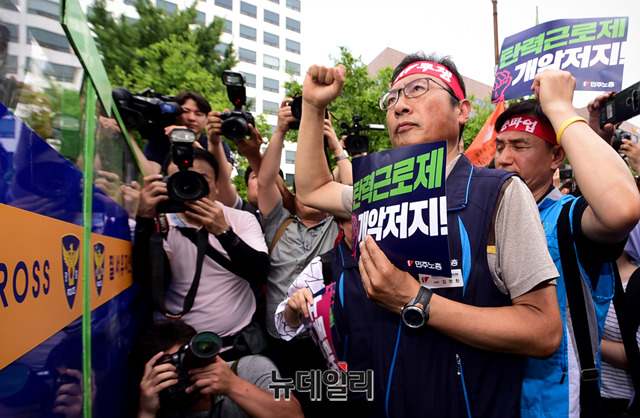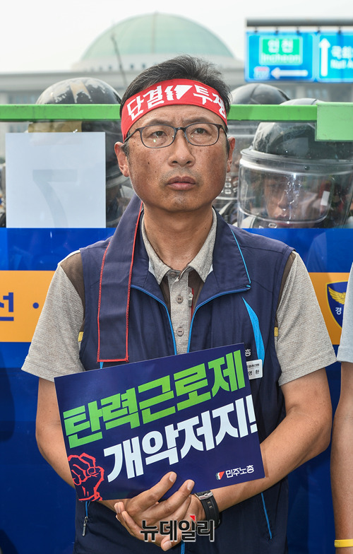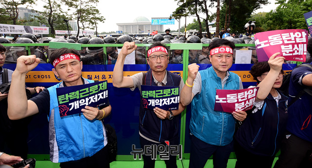 김명환 민노총 위원장이 18일 오후 국회 앞에서 열린 총파업 대회에서 경찰과 대치하며 구호를 외치고 있다.