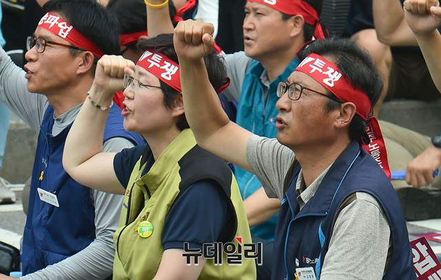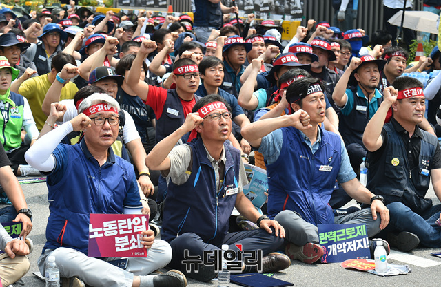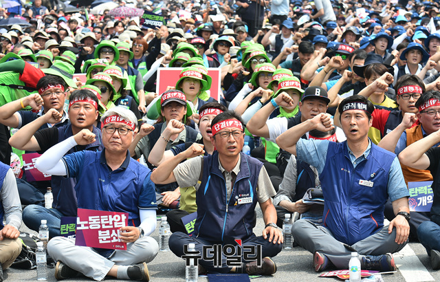 김명환 민노총 위원장이 18일 오후 서울 여의도 국회 앞에서 열린 총파업 대회에 참석해 팔뚝질을 하고 있다.