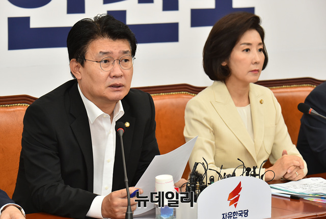 정용기 자유한국당 정책위의장이 19일 오전 국회에서 열린 원내대책회의에서 모두발언을 하고 있다.