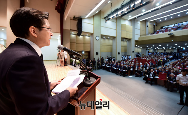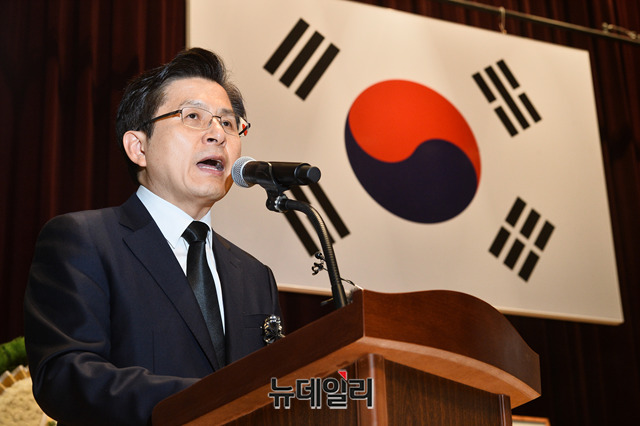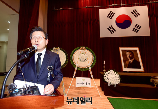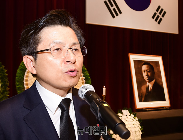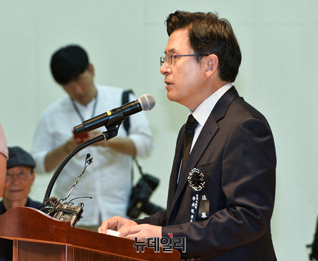 황교안 자유한국당 대표가 19일 오전 서울 동작구 국립서울현충원에서 열린 '이승만 전 대통령 서거 54주기 추모식'에서 추모사를 하고 있다.'이승만건국대통령기념사업회' 주관으로 열리는 추모식에는 황교안 자유한국당 대표, 김진태 의원, 전희경 의원, 강효상 의원, 조원진, 홍문종 우리공화당 공동대표, 김문수 전 경기지사, 이홍구 전 국무총리, 신철식 이승만건국대통령 기념사업회장 등 700여 명이 참석했다.이승만 전 대통령은 해방 후 제헌국회의장과 제1∼3대 대통령을 거치며 국가안보와 자유 민주국가 발전의 기틀 마련에 앞장섰다. 이 대통령은 1965년 7월 19일 향년 91세로 하와이에서 서거했다. 유가족의 뜻에 따라 같은 해 7월 27일 가족장으로 국립서울현충원에 안장됐다.