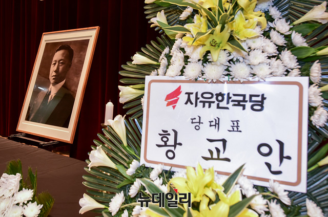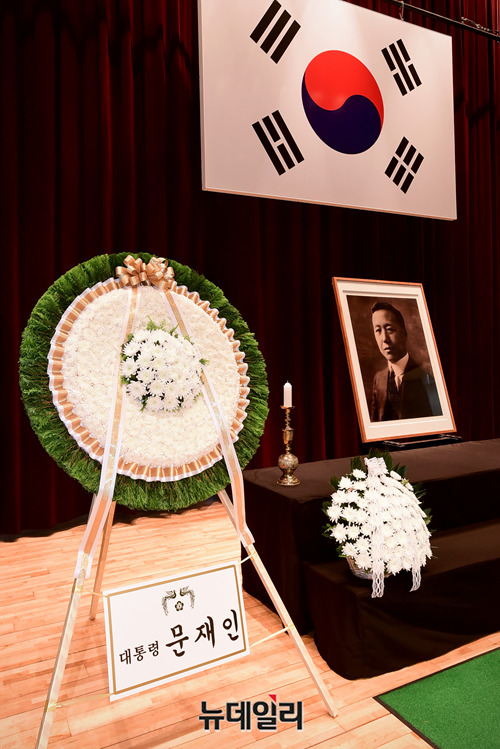 문재인 대통령과 황교안 자유한국당 대표의 추모 화환이 19일 오전 서울 동작구 국립서울현충원에서 열린 '이승만 전 대통령 서거 54주기 추모식'에 나란히 놓여 있다.'이승만건국대통령기념사업회' 주관으로 열리는 추모식에는 황교안 자유한국당 대표, 김진태 의원, 전희경 의원, 강효상 의원, 조원진, 홍문종 우리공화당 공동대표, 김문수 전 경기지사, 이홍구 전 국무총리, 신철식 이승만건국대통령 기념사업회장 등 700여 명이 참석했다.이승만 전 대통령은 해방 후 제헌국회의장과 제1∼3대 대통령을 거치며 국가안보와 자유 민주국가 발전의 기틀 마련에 앞장섰다. 이 대통령은 1965년 7월 19일 향년 91세로 하와이에서 서거했다. 유가족의 뜻에 따라 같은 해 7월 27일 가족장으로 국립서울현충원에 안장됐다.