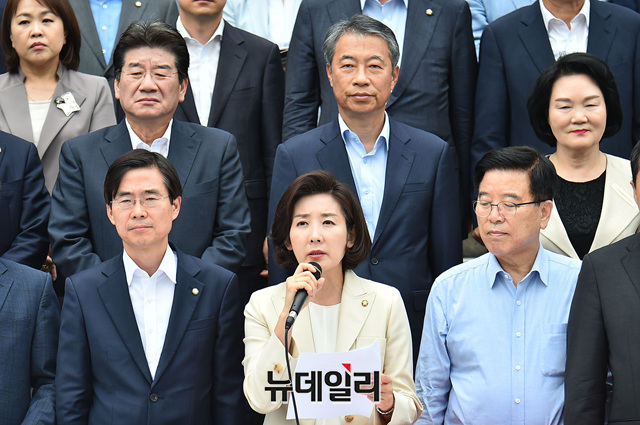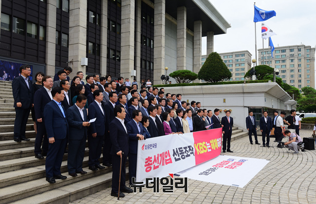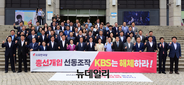 나경원 자유한국당 원내대표 등 소속 의원들이 19일 오후 KBS 본관 앞 계단에서 KBS 선거개입 규탄 기자회견을 하고 있다.