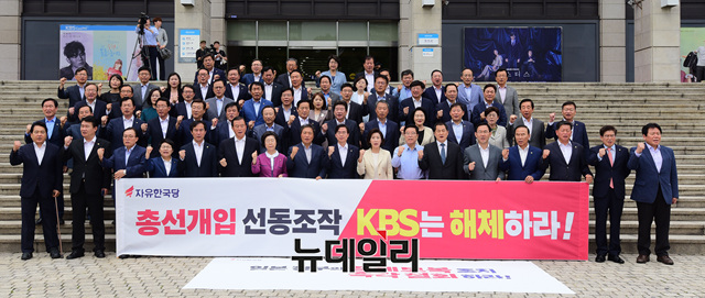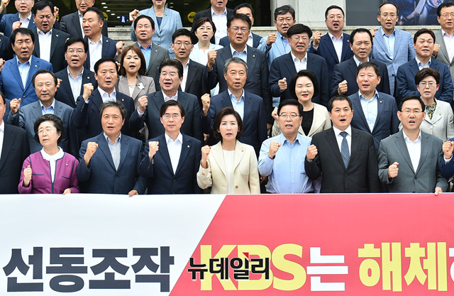 나경원 자유한국당 원내대표 등 소속 의원들이 19일 오후 서울 여의도 KBS 본관 앞 계단에서 KBS 선거개입 규탄 기자회견에 앞서 구호를 외치고 있다.