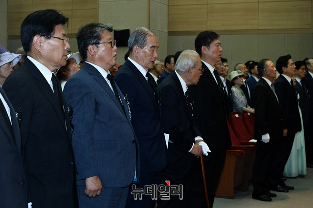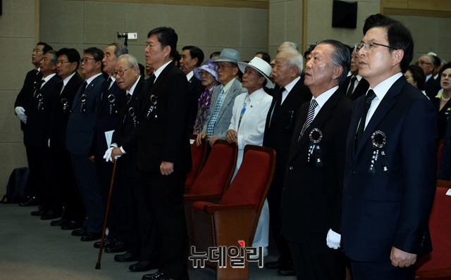 황교안 자유한국당 대표, 조원진 우리공화당 공동대표, 홍문종 공동대표, 신철식 이승만건국대통령 기념사업회 회장이 19일 오전 서울 동작구 국립서울현충원에서 열린 '이승만 전 대통령 서거 54주기 추모식'에 참석해 애국가를 제창하고 있다.(사)이승만건국대통령기념사업회 주관으로 열리는 추모식에는 황교안 자유한국당 대표, 김진태 의원, 전희경 의원, 강효상 의원, 조원진 우리공화당 공동대표, 홍문종 공동대표, 김문수 전 도지사, 이홍구 전 국무총리, 신철식 이승만건국대통령 기념사업회 회장 등 700여명이 참석했다.이승만 전 대통령은 조국의 독립을 위해 평생을 헌신했다. 해방 후에는 제헌국회의장과 제1∼3대 대통령을 거쳐 국가안보와 자유 민주국가 발전의 기틀 마련에 앞장섰다. 이 대통령은 1965년 7월 19일 향년 91세로 하와이에서 서거했으며, 유가족의 뜻에 따라 같은 해 7월 27일 가족장으로 국립서울현충원에 안장됐다.
