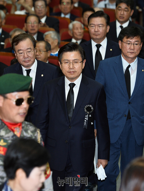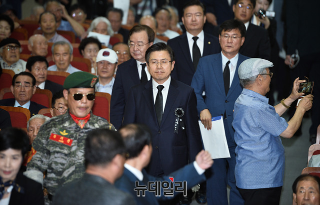 황교안 자유한국당 대표가 19일 오전 서울 동작구 국립서울현충원에서 열린 '이승만 전 대통령 서거 54주기 추모식'에 입장하고 있다.(사)이승만건국대통령기념사업회 주관으로 열리는 추모식에는 황교안 자유한국당 대표, 김진태 의원, 전희경 의원, 강효상 의원, 조원진 우리공화당 공동대표, 홍문종 공동대표, 김문수 전 도지사, 이홍구 전 국무총리, 신철식 이승만건국대통령 기념사업회 회장 등 700여명이 참석했다.이승만 전 대통령은 조국의 독립을 위해 평생을 헌신했다. 해방 후에는 제헌국회의장과 제1∼3대 대통령을 거쳐 국가안보와 자유 민주국가 발전의 기틀 마련에 앞장섰다. 이 대통령은 1965년 7월 19일 향년 91세로 하와이에서 서거했으며, 유가족의 뜻에 따라 같은 해 7월 27일 가족장으로 국립서울현충원에 안장됐다.