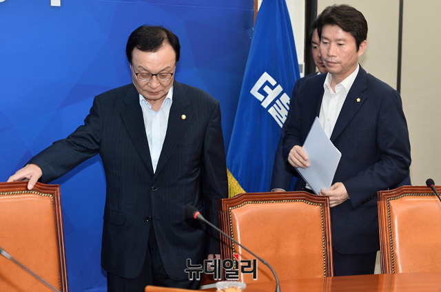 이해찬 더불어민주당 대표와 이인영 원내대표가 22일 오전 국회에서 열린 최고위원회의에 입장하고 있다.