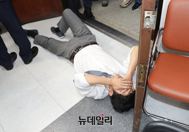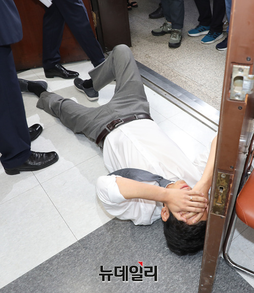 [포토] 바닥에 쓰러진 권성주 바른미래당 혁신위원