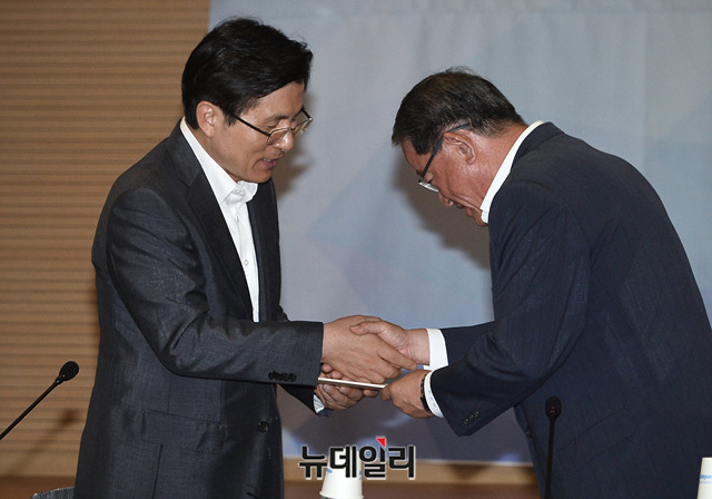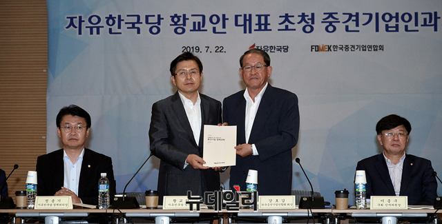 황교안 자유한국당 대표가 22일 오후 서울 마포구 한국중견기업연합회에서 열린 '중견기업인과의 대화'에서 강호갑 중견련 회장에게 '정책 과제 건의 사항'을 전달받고 기념촬영을 하고 있다.