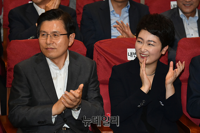 황교안 자유한국당 대표가 22일 오후 국회 의원회관에서 열린 이언주 무소속 의원의 '나는 왜 싸우는가' 출판 리셉션에 참석해 이 의원과 대화를 나누고 있다.