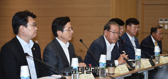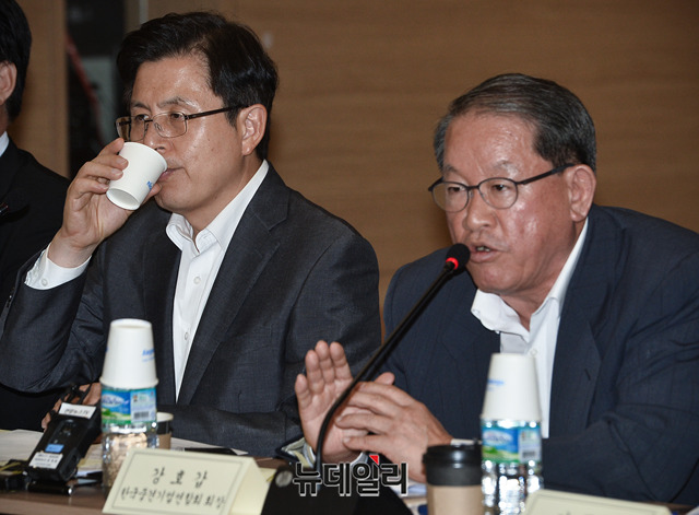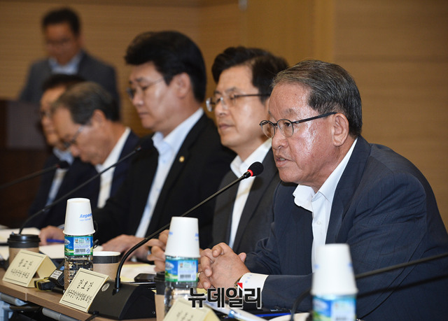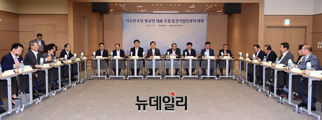 강호갑 한국중견기업연합회 회장이 22일 오후 서울 마포구 한국중견기업연합회에서 열린 '자유한국당 황교안 대표 초청 중견기업인과의 대화'에서 환영사를 하고 있다.