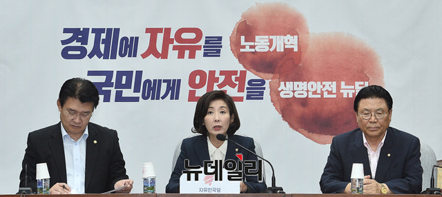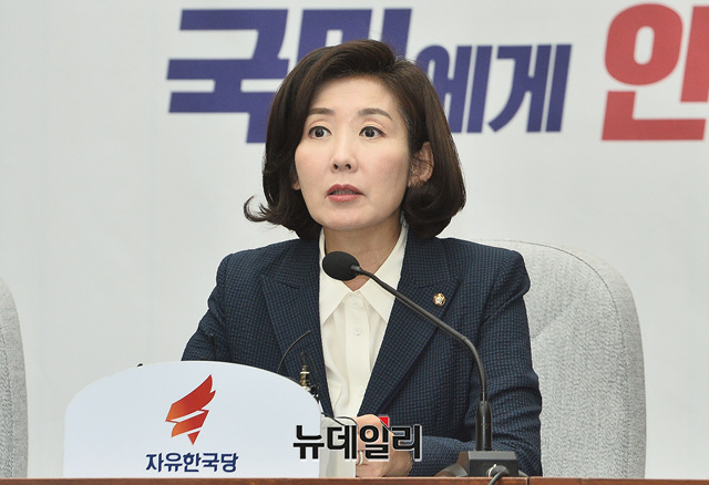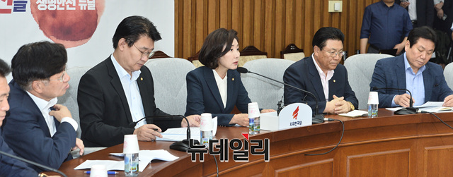 나경원 자유한국당 원내대표가 23일 오전 국회에서 열린 원내대책회의에 참석해 모두발언을 하고 있다.