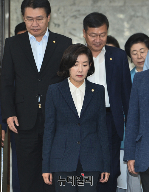 나경원 자유한국당 원내대표, 정용기 정책위의장 등 원내지도부가 23일 오전 국회에서 열린 원내대책회의에 참석하기 위해 입장하고 있다.