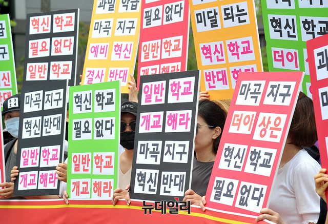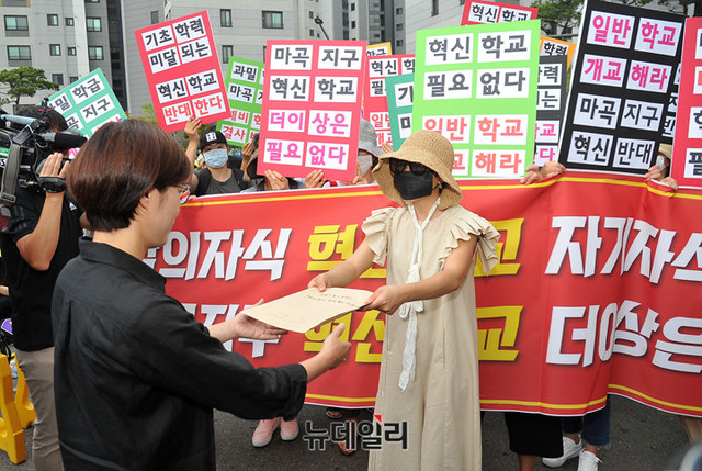 배정화 마곡2중(가칭) 예비혁신반대 추진위원장이 23일 오전 서울 종로구 서울시교육청 앞에서 기자회견을 마치고, 서울시교육청 관계자에게 예비혁신 반대 합의 서한서를 전달하고 있다.앞서 서울시교육청은 올해부터 교육감 임의 지정 지침을 삭제한 대신 신설 학교를 모두 1년간 예비혁신학교로 지정하는 지침을 만들었다. 이에 마곡2중 예비혁신반대 추진위는 "예비혁신학교로 개교 후 일반학교로 전환시 학부모에게 결정 권한이 없고 과정도 투명하지 않다"며 "또한 혁신학교에서 실험 시작을 위해 전입된 전교조 출신 교사들이 그대로 배정돼 있어 절대 받아들일 수 없다"고 우려했다.