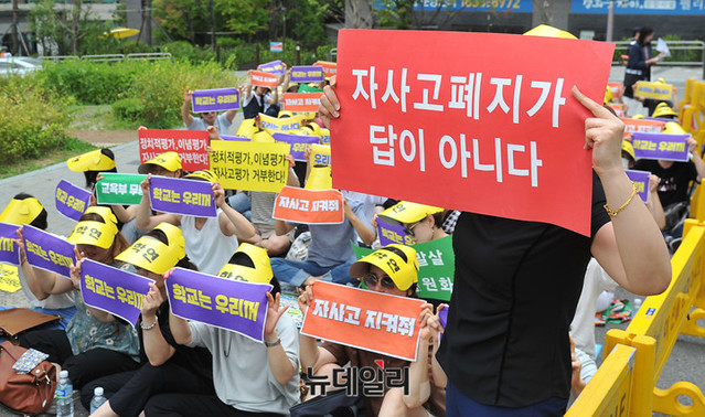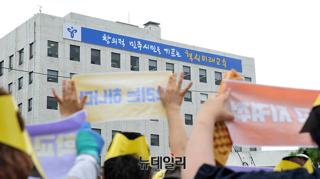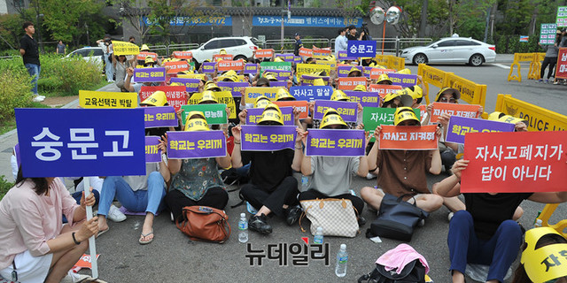 숭문고등학교 학부모들이 23일 오전 서울 종로구 서울시교육청 앞에서 자율형사립고등학교 재지정 취소 철회를 촉구하며 구호를 외치고 있다. 숭문고에 이어 신일고와 이대부고 학부모들도 이날 오후에 릴레이 반발집회를 이어갈 예정이다.