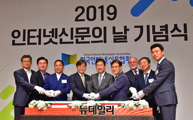 박양우 문화체육관광부 장관, 이근영 한국인터넷신문협회장 등 내빈들이 23일 오후 서울 중구 한국프레스센터에서 열린 '제3회 인터넷 신문의 날' 기념식에서 기념떡을 자르며 기념촬영을 하고 있다.이날 기념식에는 공모를 통해 선정한 '인터넷 언론상' 시상식이 진행됐다.