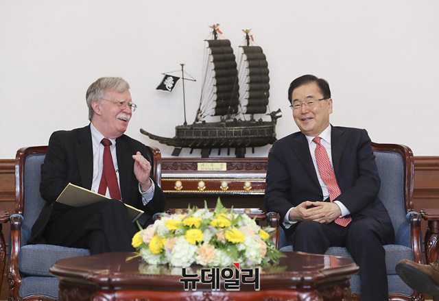 정의용 청와대 국가안보실장이 24일 오전 청와대를 방문한 존 볼턴 미국 백악관 국가안보회의(NSC) 보좌관과 면담 전 악수를 나누고 있다. (사진=청와대)