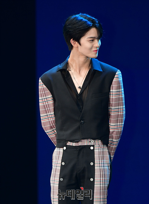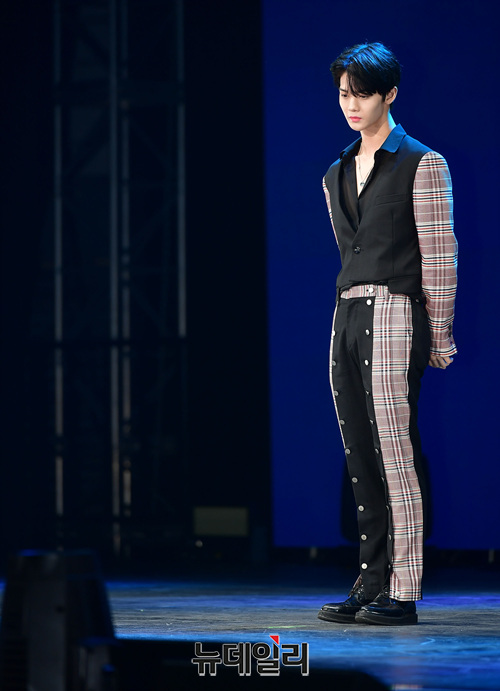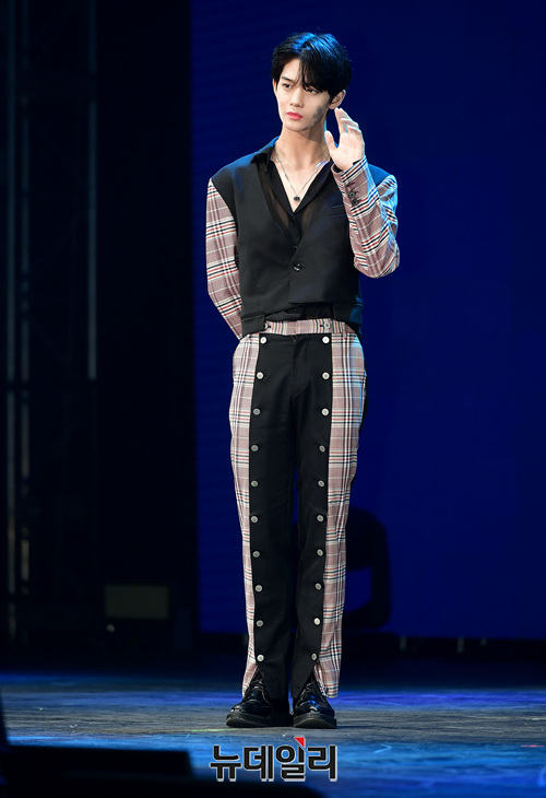 5인조 아이돌그룹 CIX(씨아이엑스) 멤버 배진영이 24일 오후 서울 송파구 올림픽공원 SK핸드볼경기장에서 열린 데뷔 쇼케이스에서 포토타임을 갖고 있다.
