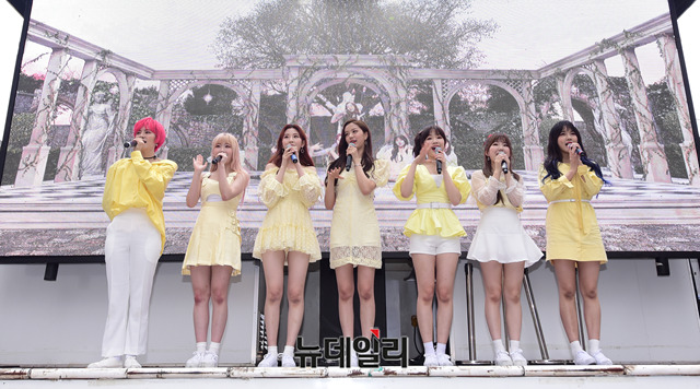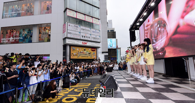 걸그룹 공원소녀가 24일 오후 서울 중구 명동밀리오레 앞에서 컴백 기념 '윙카 버스킹' 공연을 선보인 직후 팬들에게 감사인사를 하고 있다.