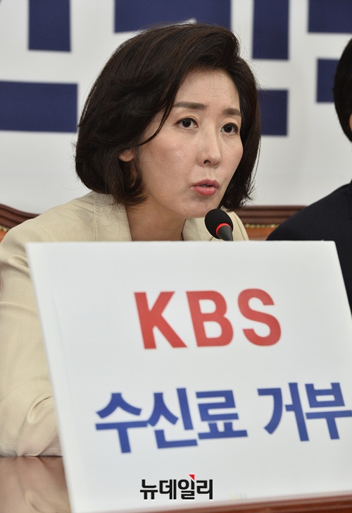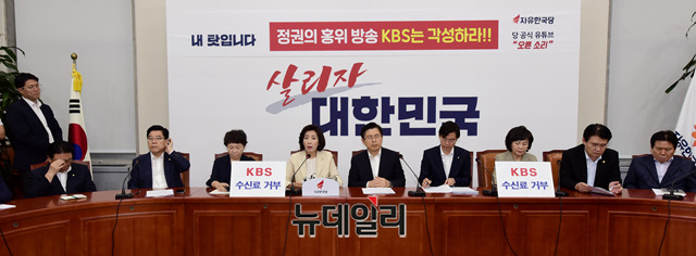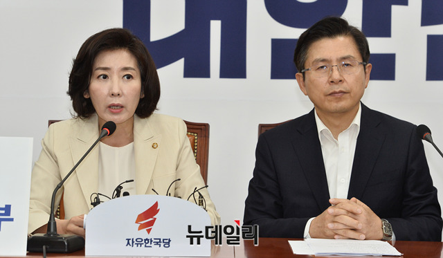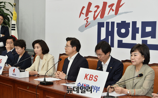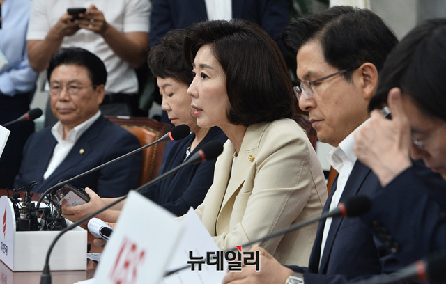 나경원 자유한국당 원내대표가 25일 오전 국회에서 열린 최고위원회의에서 모두발언을 하고 있다. 이날 최고위에는 김순례 최고위원이 최고위원직을 회복한 후 처음으로 참석했다.