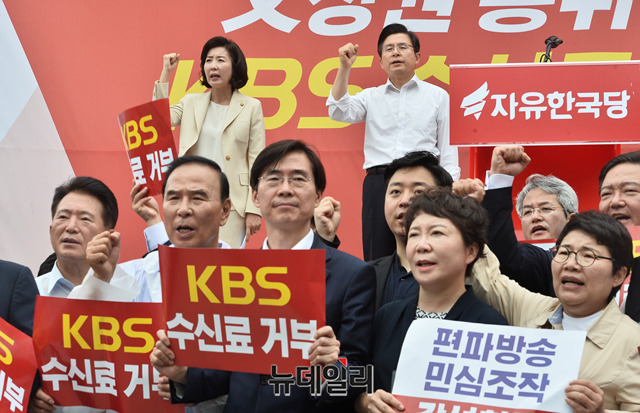황교안 자유한국당 대표, 나경원 원내대표 및 소속 의원들이 25일 오전 국회 앞에서 열린 'KBS 수신료 거부 서명운동 출정식'에서 구호를 외치고 있다.