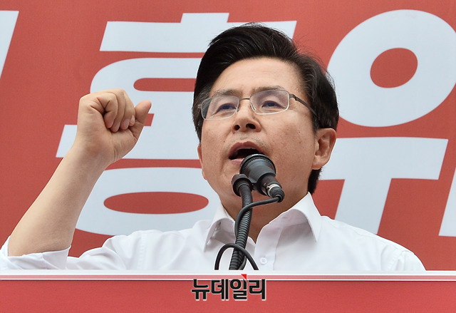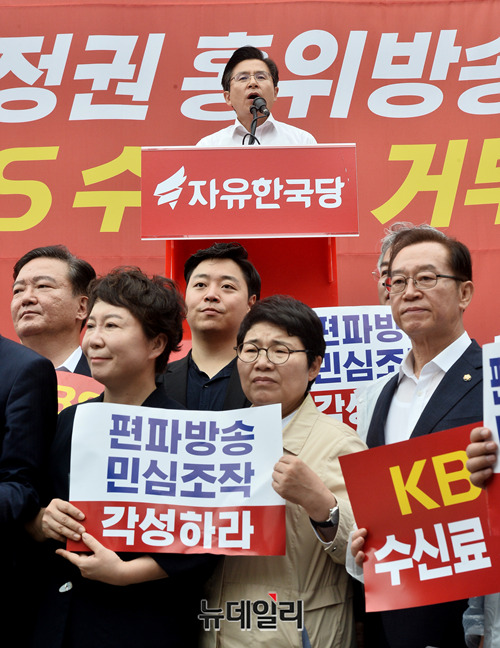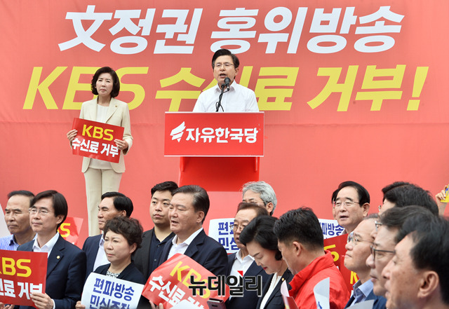 황교안 자유한국당 대표가 25일 오전 국회 앞에서 열린 'KBS 수신료 거부 서명운동 출정식'에서 KBS 규탄발언을 하고 있다.