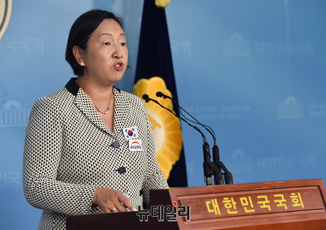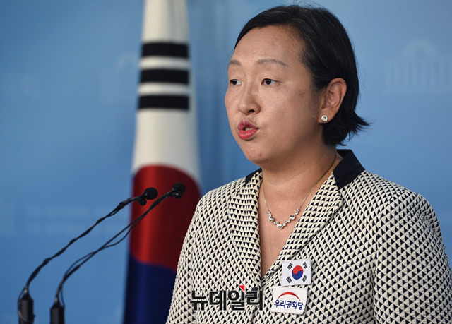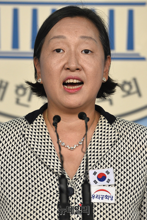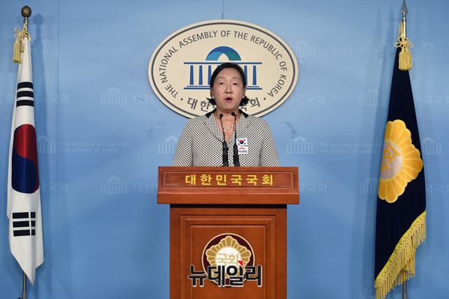 인지연 우리공화당 수석대변인이 25일 오후 국회 정론관에서 기자회견을 열고, 서울시가 낸 '광화문광장 천막 금지' 가처분 신청이 각하된 것과 관련해 발언하고 있다.