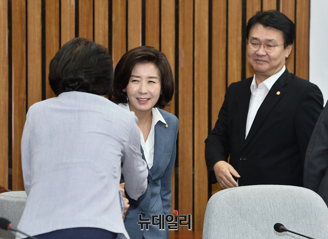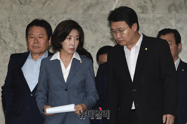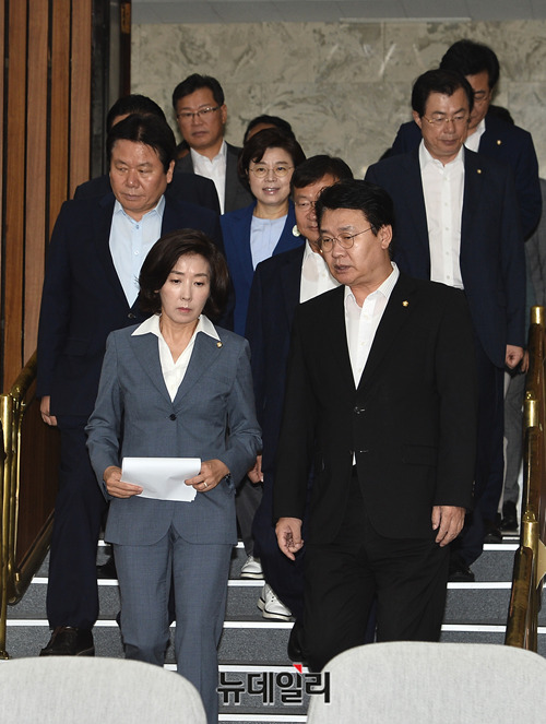 나경원 자유한국당 원내대표, 정용기 정책위의장 및 지도부가 26일 오전 국회에서 열린 원내대책회의에 입장하고 있다.