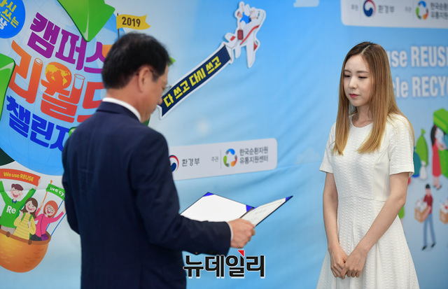 베이비복스 출신 간미연이 26일 오전 서울 서초구 한국순환자원유통지원센터에서 열린 '2019캠퍼스리월드챌린지' 홍보대사 위촉식에서 정회석 이사장으로부터 위촉장을 받고 기념촬영을 하고 있다.