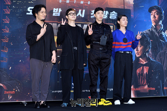 래퍼 버벌진트(왼쪽부터), 기리보이, 비와이, 밀릭이 26일 오전 서울 마포구 CJ E&M에서 열린 Mnet '쇼미더머니 8(SHOW ME THE MONET 8)' 제작발표회에서 포토타임을 갖고 있다.'쇼미더머니'는 힙합 씬의 최고의 프로듀서들이 랩 배틀을 펼칠 래퍼를 선발, 치열한 대결을 통해 우승 상금의 주인공을 가려내는 서바이벌 프로그램이다. '쇼미더머니8'은 기존의 4팀 체제를 버리고 '40크루', 'BGM-v크루' 등 두 개의 크루 체제를 도입해 랩 배틀에서 정면으로 맞붙게 된다. 26일 밤 11시 Mnet에서 첫 방송.