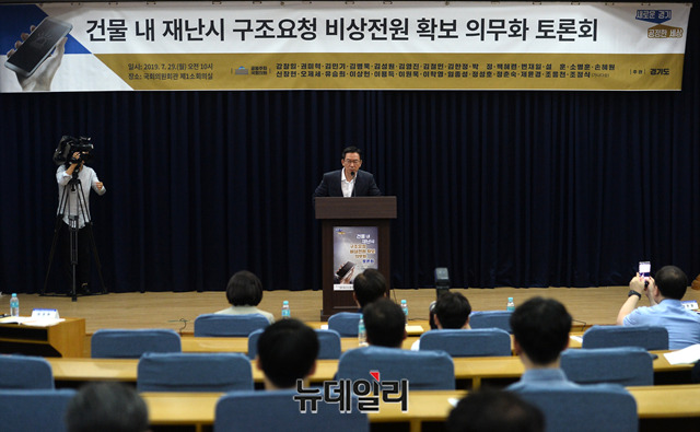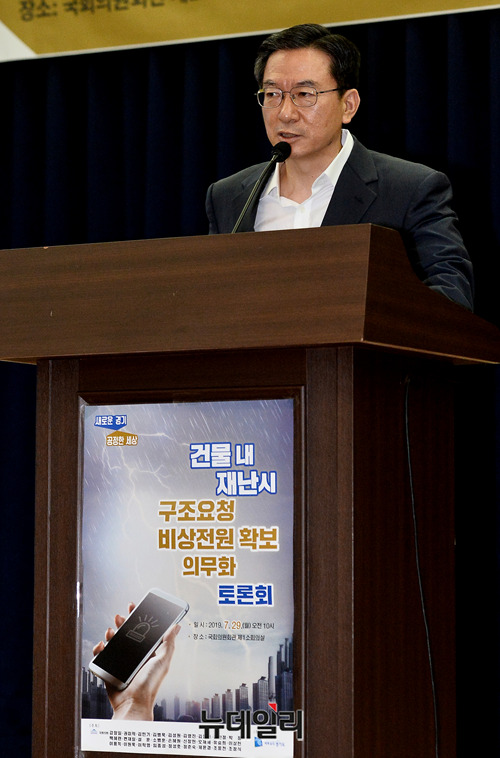 정성호 더불어민주당 의원이 29일 오전 국회 의원회관에서 열린 '건물 내 재난시 구조요청 비상전원 확보 의무화 토론회'에서 모두발언을 하고 있다.