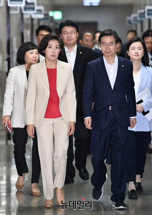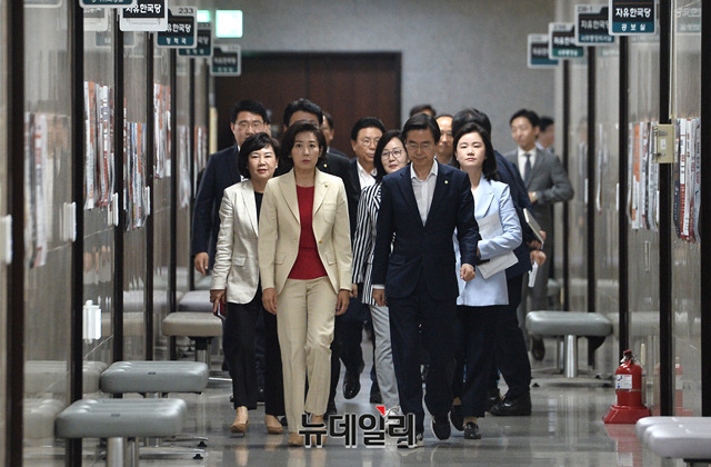 나경원 자유한국당 원내대표 및 최고위원들이 29일 오전 국회에서 열린 최고위원회의에 입장하고 있다.