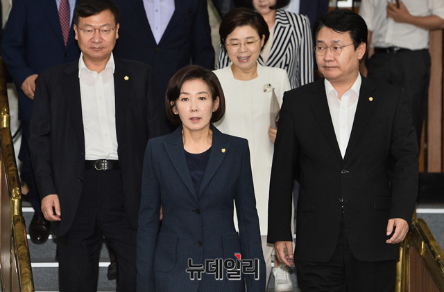 나경원 자유한국당 원내대표와 정용기 정책위의장 및 의원들이 30일 오전 국회에서 열린 원내대책회의에 입장하고 있다.
