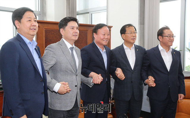 [포토] 손 맞잡고 기념촬영하는 '김재원-여·야 3당 간사'