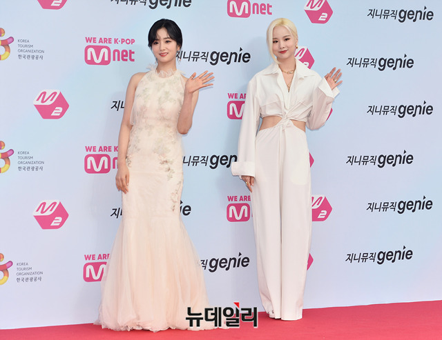 에이핑크 맴버 보미(왼쪽)와 EXID 맴버 솔지가 1일 오전 서울 송파구 KSPO DOME(올림픽공원 체조경기장)에서 열린 '2019 제1회 M2 X GENIE MUSIC AWARDS(이하 2019 MGMA)' 레드카펫 행사에서 포토타임을 갖고 있다.'2019 MGMA'는 엠넷과 지니뮤직이 공동으로 주최하는 대중음악 시상식으로 모델 한혜진이 단독 호스트를 맡았다. 시상은 대상, 음악 부문, 특별 부문, 지니뮤직 인기상, 글로벌 인기상 등이다.본 시상식은 오후 7시부터 지니뮤직 홈페이지와 모바일 애플리케이션, 음악 전문 채널 Mnet과 디지털 채널 M2 등에서 중계된다.