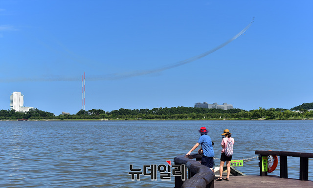 우리공군 특수비행팀 블랙이글스가 1일 오후 강원 강릉시 경포해수욕장 상공에서 연습비행을 하고 있다. 블랙이글스는 경포 썸머페스티벌 기간인 3일 오후 2시부터 경포해수욕장 상공에서 에어쇼를 펼칠 예정이다. (강원 강릉=정상윤 기자)