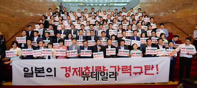 이해찬 더불어민주당 대표와 이인영 원내대표 및 소속 의원들이 2일 오후 국회 로텐더홀에서 열린 일본의 화이트리스트 배제조치 규탄대회에서 구호를 외치고 있다.