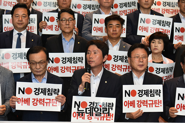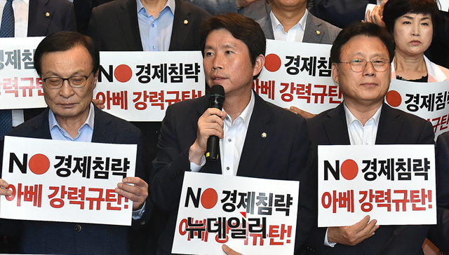 이인영 더불어민주당 원내대표가 2일 오후 국회 로텐더홀에서 열린 일본의 화이트리스트 배제조치 규탄대회에 발언을 하고 있다.
