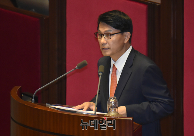윤상현 국회 외교통일위원장이 2일 오후 국회 본회의장에서 열린 본회의에서 '일본 정부의 보복적 수출규제 조치 철회 촉구 결의안' 제안설명을 하고 있다.