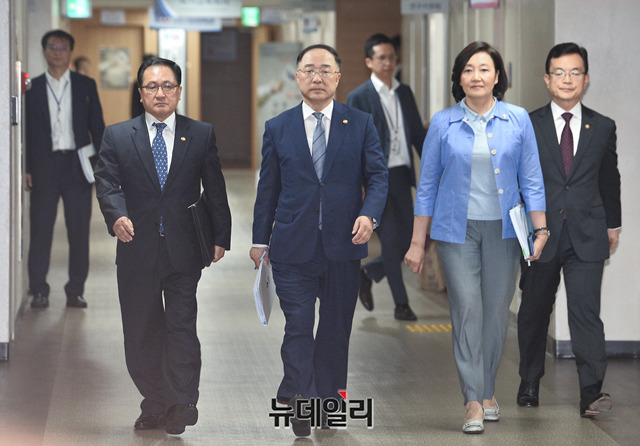 홍남기 부총리 겸 기획부장관, 유영민 과학기술정보통신부 장관, 박영선 중소벤처기업부 장관, 조세영 외교부 1차관이 2일 오후 서울 종로구 서울정부청사에서 일본 정부의 화이트리스트 한국배제 조치에 따른 관계부처 합동브리핑을 갖기 위해 브리핑장에 입장하고 있다.