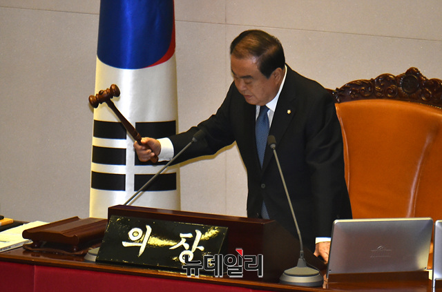 문희상 국회의장이 2일 오후 국회에서 열린 본회의에서 '일본 정부의 보복적 수출규제 조치 철회 촉구 결의안'을 통과시키고 있다.