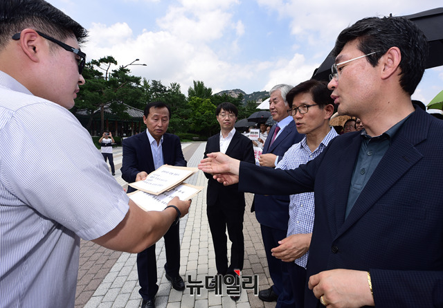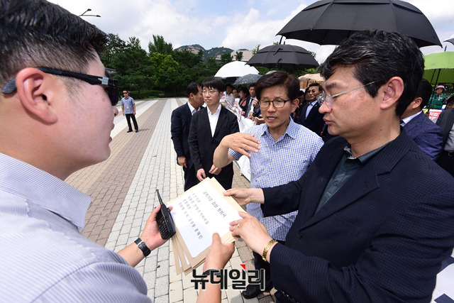 김문수 전 경기지사, 전광훈 한기총 대표 및 참석자들이 2일 오전 서울 종로구 청와대 앞 분수대광장에서 열린 '외교무능·경제참상·안보해체 문재인 하야 촉구 기자회견'에서 청와대 관계자에게 청구서를 전달하고 있다.이날 기자회견에서는 국방장관 국가안보실장 직권면직 청원서, 국방부 정보공개 청구서, 청와대 경호처 정보공개 청구서, 대통령 비서실 정보공개 청구서, 국가안보실 정보공개 청구서, 공직기강 감찰 청원서 등 총 6건의 청구서를 청와대 관계자에게 전달했다.
