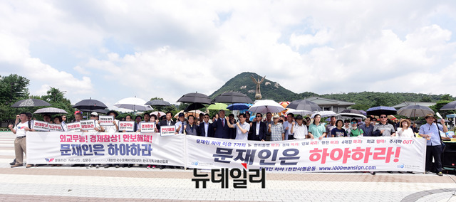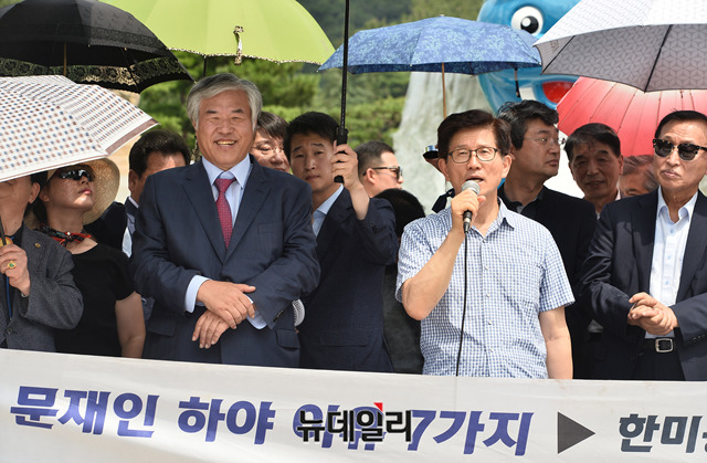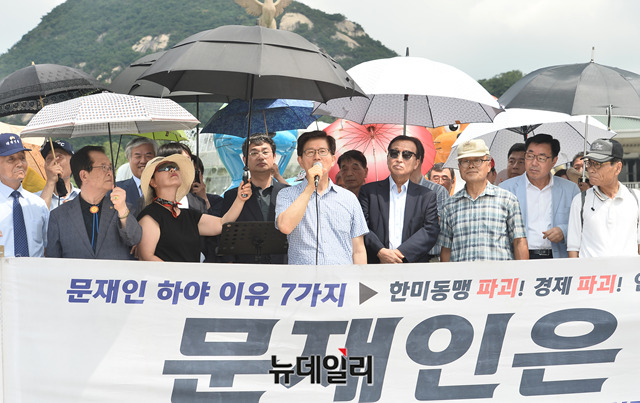 김문수 전 경기지사가 2일 오전 서울 종로구 청와대 앞 분수대광장에서 열린 '외교무능·경제참상·안보해체 문제인 하야 촉구 기자회견'에서 모두발언을 하고 있다.