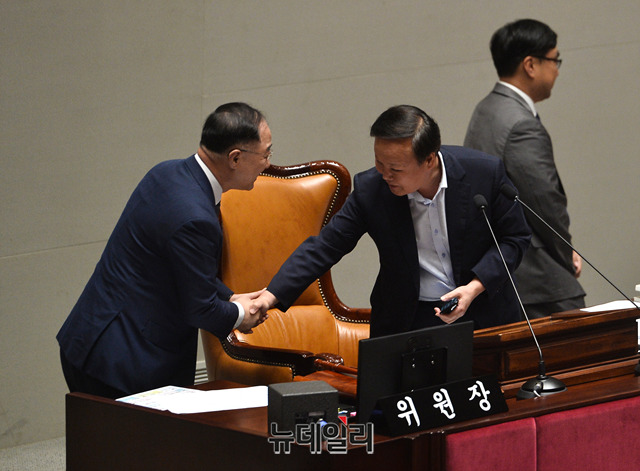 김재원 예결위원장과 홍남기 부총리 겸 기획재정부 장관이 2일 오후 국회에서 열린 예산결산특별위원회 전체회의를 마친 직후 인사를 하고 있다.
