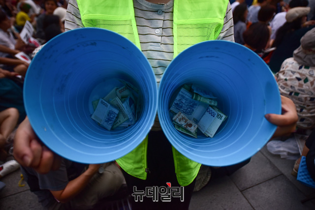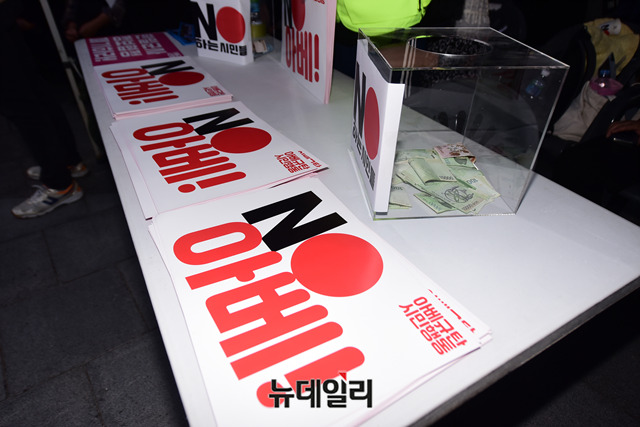 민노총, 한국진보연대 등 좌파단체가 모인 '아베규탄시민행동'이 3일 오후 서울 종로구 옛 일본대사관 앞에서 열린 아베 규탄 3차 촛불 집회에서 모금을 하고 있다.