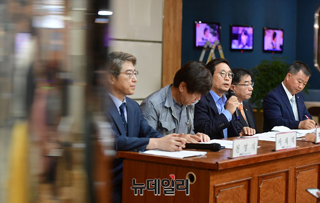 황우섭 KBS 이사가 5일 오전 서울 여의도 KBS 본관 시청자광장에서 지난 7월 31일 통과된 'KBS이사회운영규정' 개정안을 즉각 철회할 것을 요구하는 기자회견에서 모두 발언을 하고 있다.