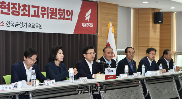 황교안 자유한국당 대표가 5일 오전 경기 시흥시 한국금형기술교육원에서 열린 현장 최고위원회의에서 모두발언을 하고 있다.이날 열린 현장 최고위는 한국당이 일본 수출규제로 피해를 입고 있는 제조업체 관계자들의 고충과 건의사항을 듣기 위해 열렸다. 지난 5월 23일 산불피해지역인 강원 고성에서 열린 현장 최고위 이후 처음이다.현장최고위에는 황 대표, 나경원 원내대표, 한국당 지도부, 서병문 중소기업중앙회 수석부회장, 권혁홍 수석부회장 등이 참석했다. (경기 시흥=박성원 기자)