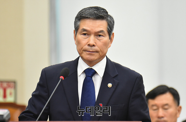 정경두 국방부 장관이 5일 오전 국회에서 열린 국방위원회 전체회의에 참석해 현안보고를 하고 있다.